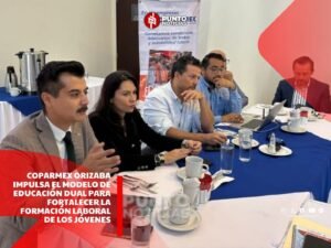 Orizaba, Ver.– Con el objetivo de fortalecer la vinculación entre el sector empresarial y las instituciones educativas, la Confederación Patronal de la República Mexicana (Coparmex) Delegación Orizaba llevó a cabo una reunión de trabajo para impulsar el Modelo de Educación Dual, esquema que permite a los estudiantes adquirir competencias laborales dentro de las empresas mientras continúan sus estudios.