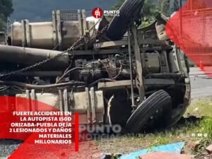 Dos personas severamente lesionadas y daños materiales millonarios fue el saldo de un choque y volcadura entre dos unidades de carga pesada, ocurrido sobre la Autopista 150D Orizaba-Puebla, a la altura de la Subestación de Pemex Mendoza. El incidente también provocó la movilización de cuerpos de emergencia y seguridad, así como el cierre parcial de la circulación vehicular.