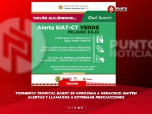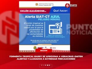 Veracruz.– La Tormenta Tropical “Barry “continúa su desplazamiento hacia territorio mexicano y se prevé que toque tierra la tarde o noche de este domingo entre los municipios de Tamiahua y Tampico Alto, en el norte de Veracruz.