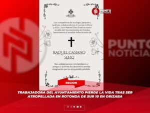 Raquel Casiano Soto, empleada del área de Parques y Jardines del Ayuntamiento de Orizaba, falleció este martes luego de ser arrollada mientras realizaba labores de jardinería en la rotonda de Sur 10 y Poniente 7.