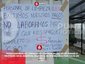 Río Blanco, Ver.– La tarde de este martes una veintena de trabajadoras de limpieza de diferentes centros de salud de la región de las Altas Montas se sumaron a la protesta que mantienen sus compañeros en el Hospital Regional de Río Blanco, ante la falta de pago de su quincena.