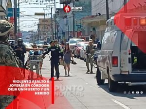 Córdoba, Ver.– Un violento asalto registrado la mañana de este lunes en una joyería del centro de la ciudad dejó como saldo una persona muerta —el propietario del local— y otra gravemente herida por impactos de arma de fuego.